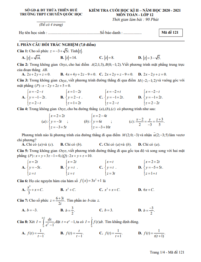 Đề thi cuối học kì 2 Toán 12 năm 2020 – 2021 trường THPT chuyên Quốc học Huế