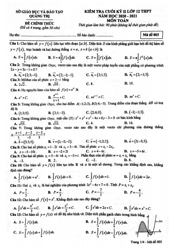 Đề thi cuối kỳ 2 Toán 12 năm học 2020 – 2021 sở GD&ĐT Quảng Trị