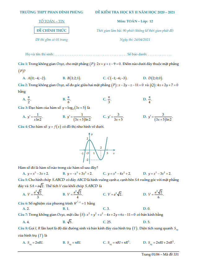 Đề thi HK2 Toán 12 năm 2020 – 2021 trường THPT Phan Đình Phùng – Hà Nội