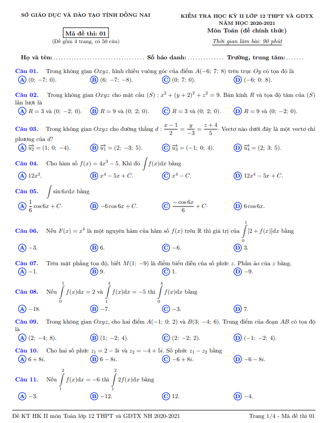 Đề thi học kỳ 2 Toán 12 năm 2020 – 2021 sở GD&ĐT tỉnh Đồng Nai
