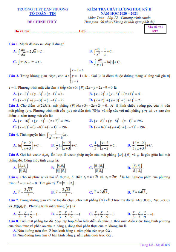 Đề thi học kỳ 2 Toán 12 năm 2020 – 2021 trường THPT Đan Phượng – Hà Nội
