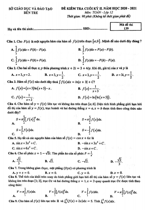 Đề kiểm tra cuối kỳ 2 Toán 12 năm 2020 – 2021 sở GD&ĐT Bến Tre