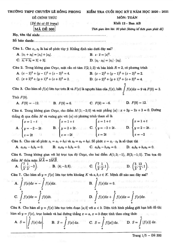 Đề thi cuối HK2 Toán 12 năm 2020 – 2021 trường chuyên Lê Hồng Phong – TP HCM