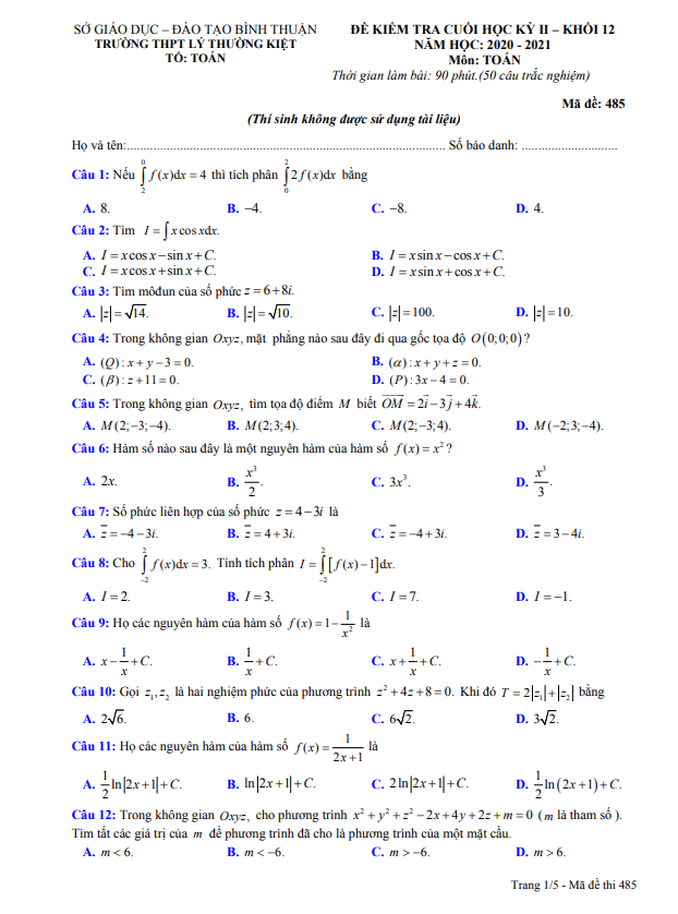 Đề thi cuối kỳ 2 Toán 12 năm 2020 – 2021 trường Lý Thường Kiệt – Bình Thuận