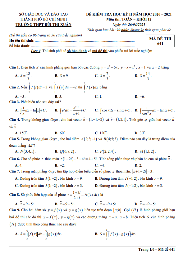 Đề thi HK2 Toán 12 năm 2020 – 2021 trường THPT Bùi Thị Xuân – TP HCM