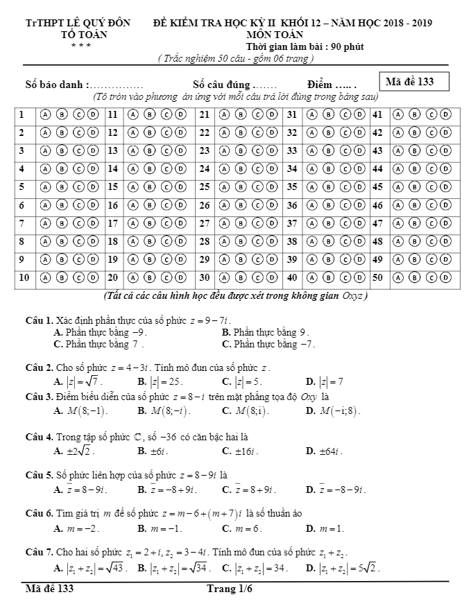 Đề thi HK2 Toán 12 năm 2018 – 2019 trường THPT Lê Quý Đôn – Hà Nội