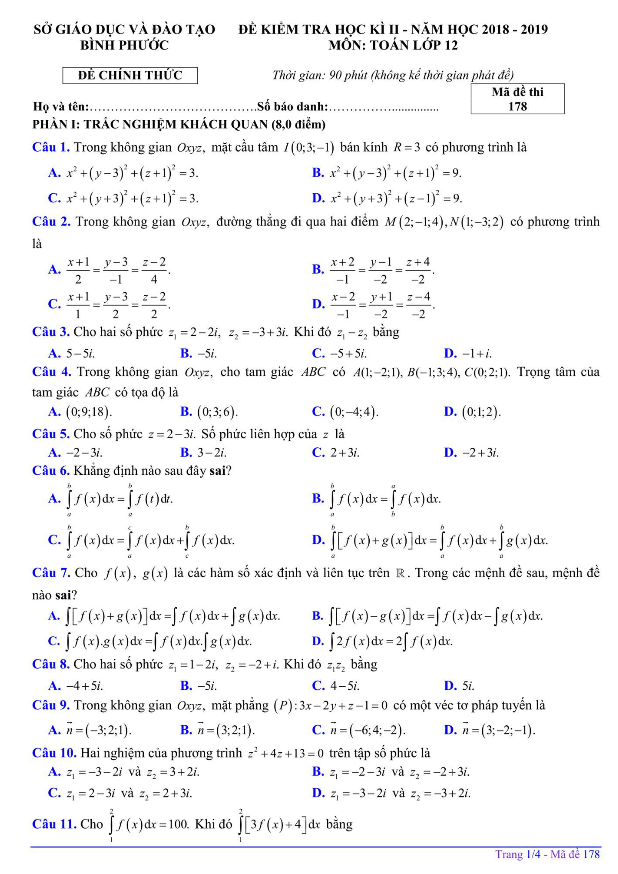 Đề kiểm tra học kì 2 Toán 12 năm 2018 – 2019 sở GD&ĐT Bình Phước