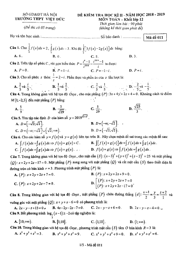 Đề kiểm tra học kỳ 2 Toán 12 năm 2018 – 2019 trường Việt Đức – Hà Nội