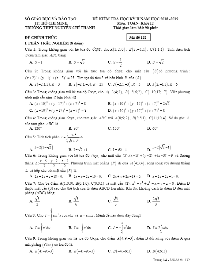 Đề thi HK2 Toán 12 năm 2018 – 2019 trường THPT Nguyễn Chí Thanh – TP HCM