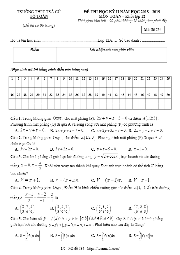 Đề thi HK2 Toán 12 năm 2018 – 2019 trường THPT Trà Cú – Trà Vinh
