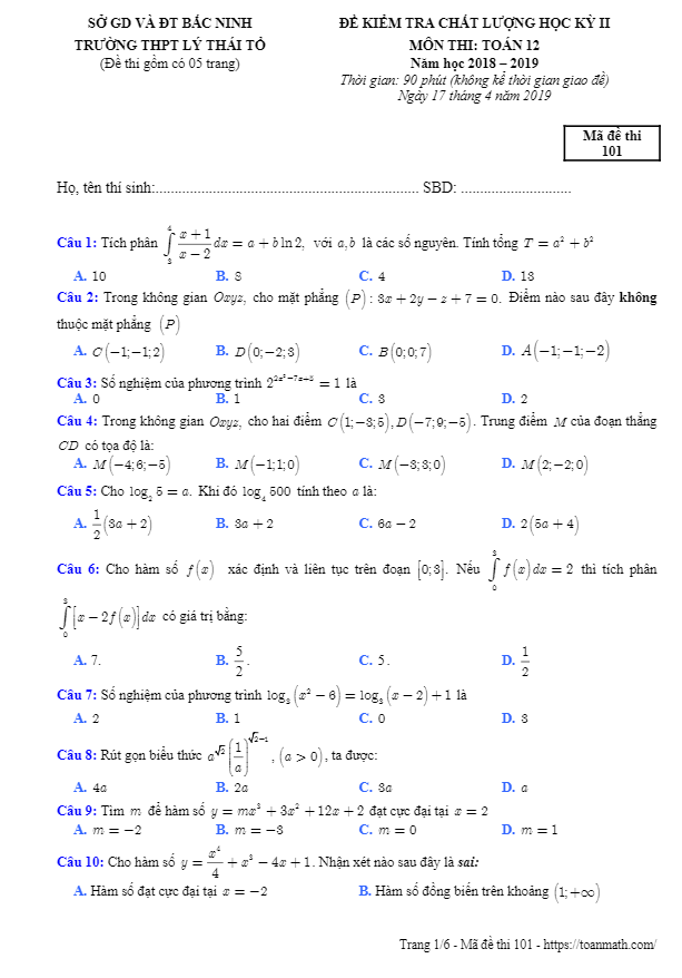 Đề thi HK2 Toán 12 năm học 2018 – 2019 trường THPT Lý Thái Tổ – Bắc Ninh