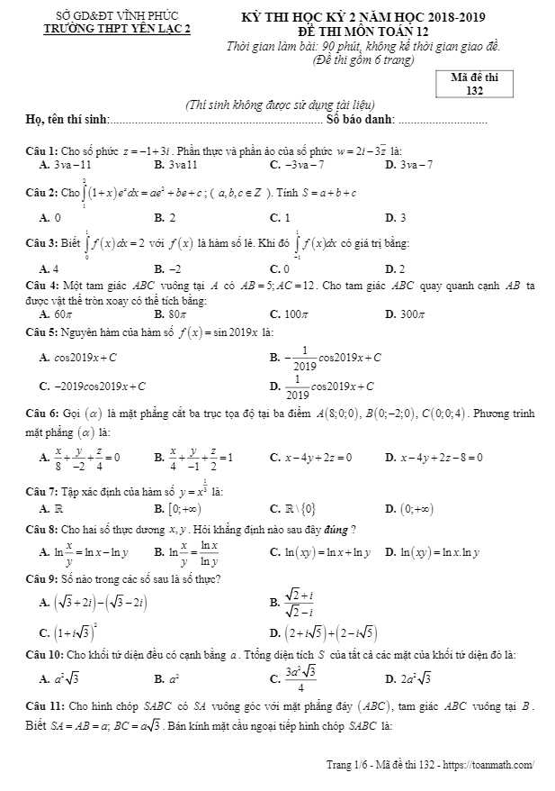 Đề thi HK2 Toán 12 năm học 2018 – 2019 trường THPT Yên Lạc 2 – Vĩnh Phúc