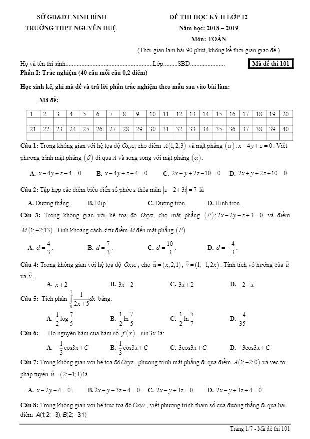 Đề thi học kỳ 2 Toán 12 năm 2018 – 2019 trường Nguyễn Huệ – Ninh Bình