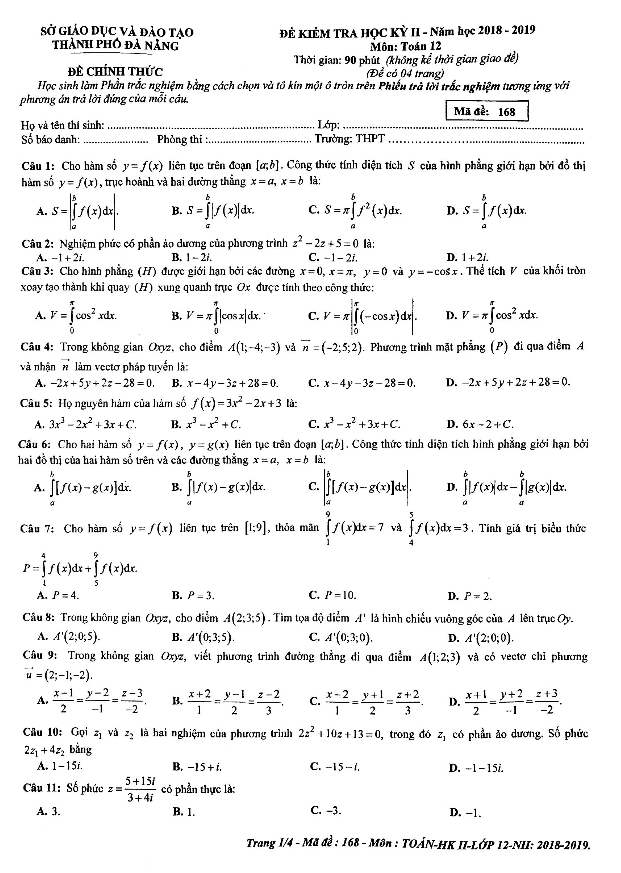 Đề thi học kỳ 2 Toán 12 năm học 2018 – 2019 sở GD&ĐT Đà Nẵng