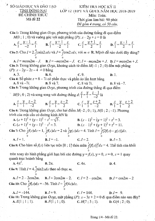 Đề thi học kỳ 2 Toán 12 năm học 2018 – 2019 sở GD&ĐT Đồng Nai
