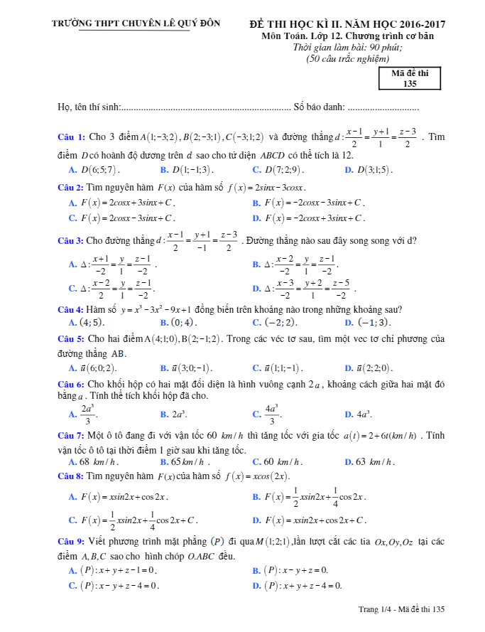Đề thi HK2 Toán 12 cơ bản năm học 2016 – 2017 trường THPT chuyên Lê Quý Đôn – Quảng Trị