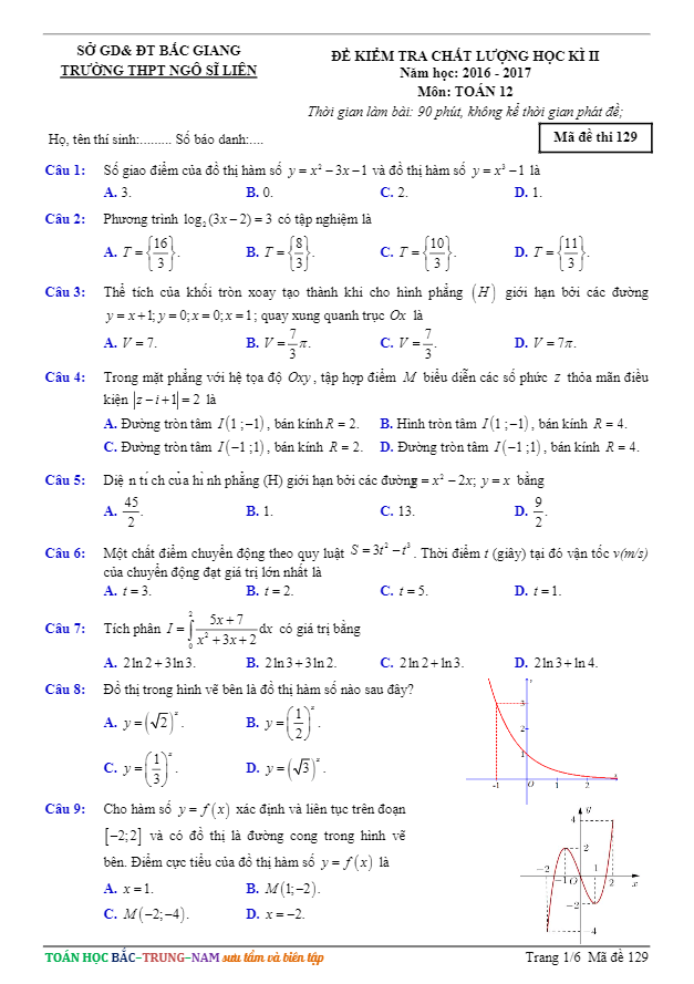 Đề thi HK2 Toán 12 năm học 2016 – 2017 trường THPT Ngô Sĩ Liên – Bắc Giang
