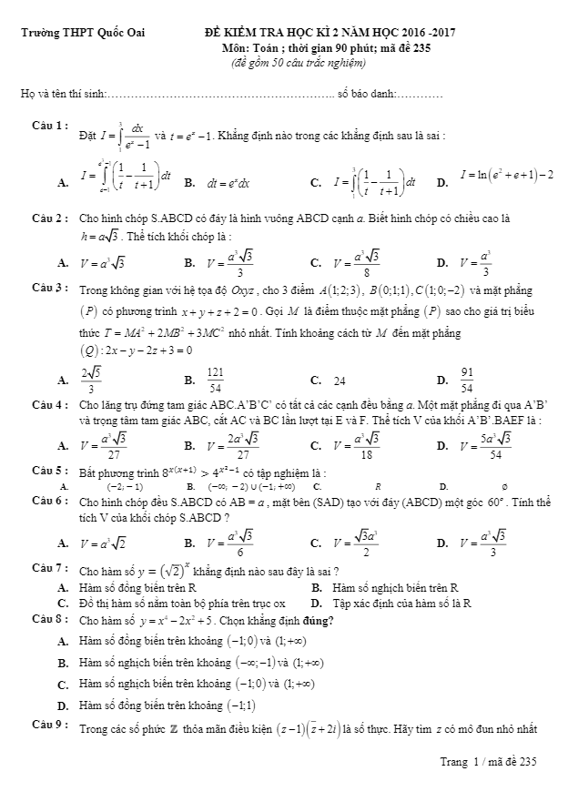 Đề thi HK2 Toán 12 năm học 2016 – 2017 trường THPT Quốc Oai – Hà Nội