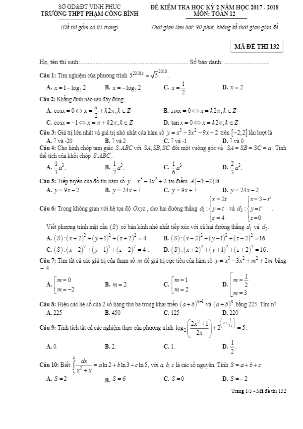 Đề kiểm tra HK2 Toán 12 năm 2017 – 2018 trường Phạm Công Bình – Vĩnh Phúc