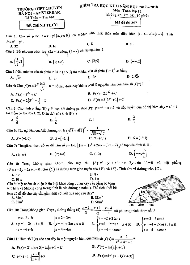 Đề kiểm tra học kỳ 2 Toán 12 năm 2017 – 2018 trường chuyên Hà Nội – Amsterdam