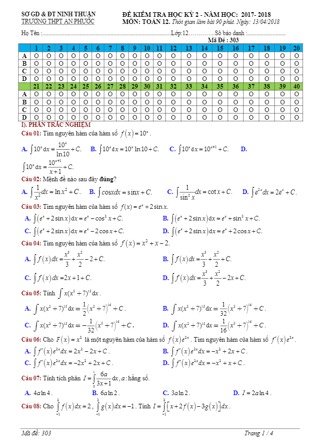 Đề kiểm tra học kỳ 2 Toán 12 năm 2017 – 2018 trường THPT An Phước – Ninh Thuận