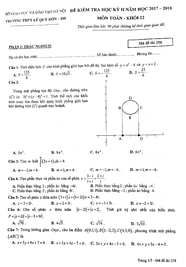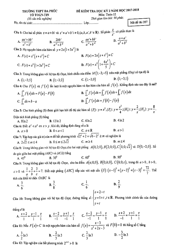 Đề thi học kỳ 2 Toán 12 năm học 2017 – 2018 trường THPT Đa Phúc – Hà Nội