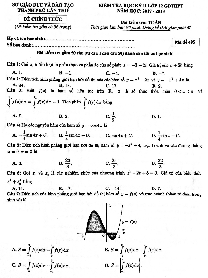 Đề kiểm tra học kỳ 2 Toán 12 năm học 2017 – 2018 sở GD và ĐT Cần Thơ