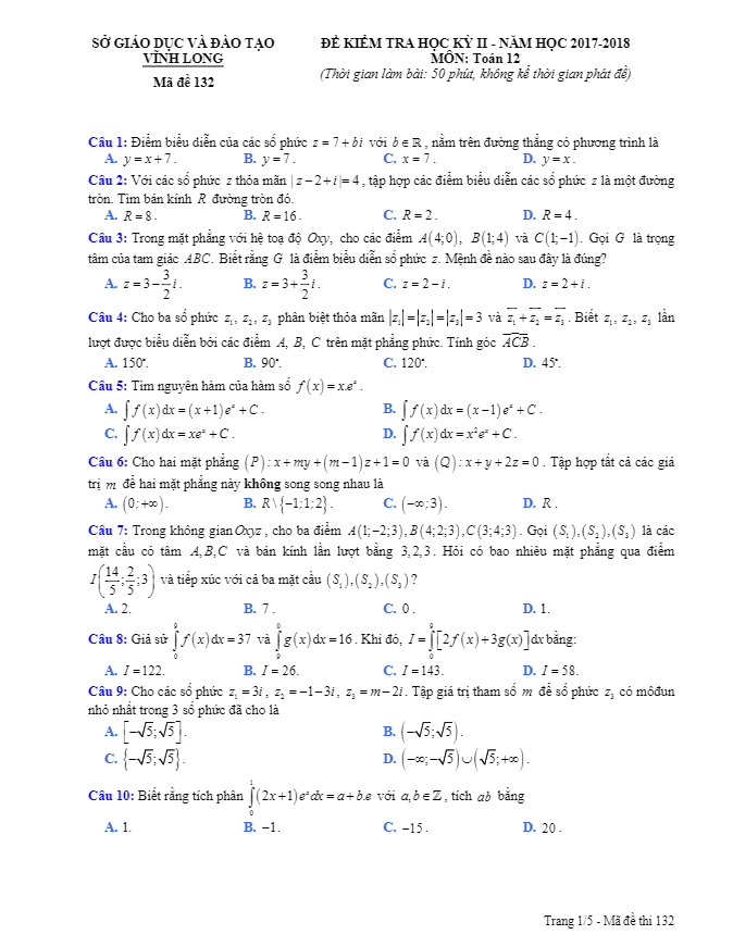Đề kiểm tra học kỳ 2 Toán 12 năm học 2017 – 2018 sở GD và ĐT Vĩnh Long