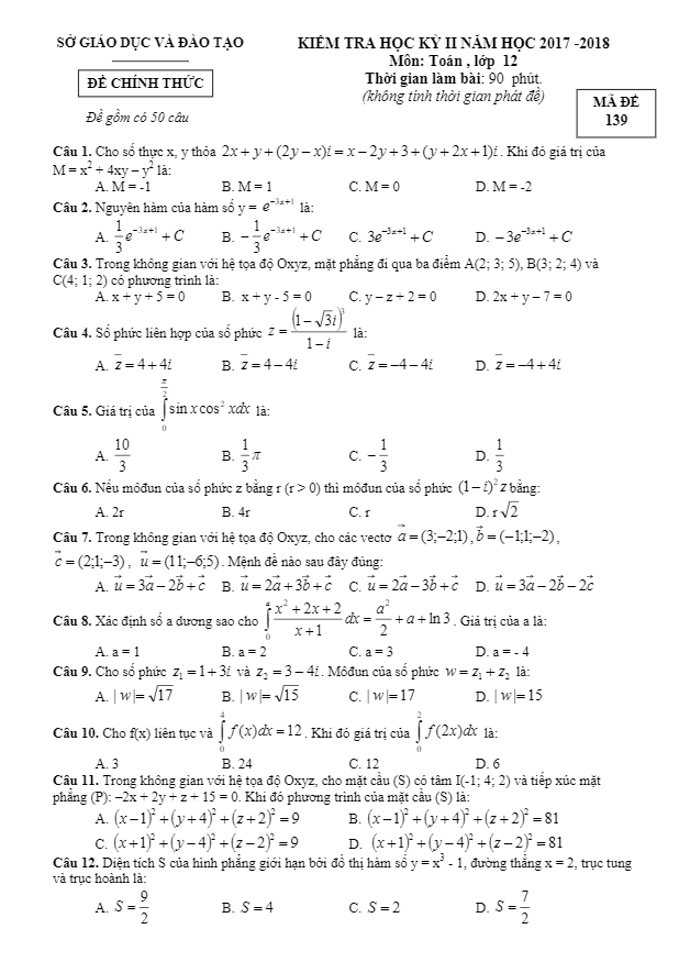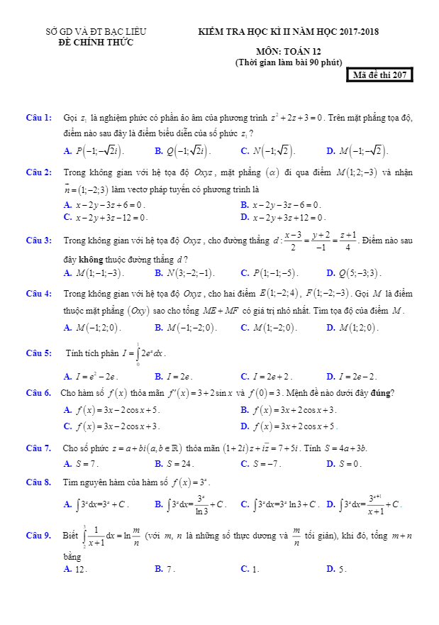 Đề thi học kỳ 2 Toán 12 năm học 2017 – 2018 sở GD và ĐT Bạc Liêu