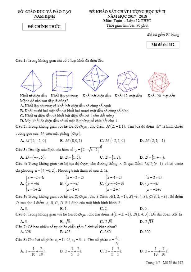 Đề KSCL học kỳ 2 Toán 12 năm học 2017 – 2018 sở GD và ĐT Nam Định
