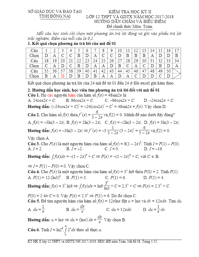 Đề thi HK2 Toán 12 năm học 2017 – 2018 sở GD và ĐT Đồng Nai