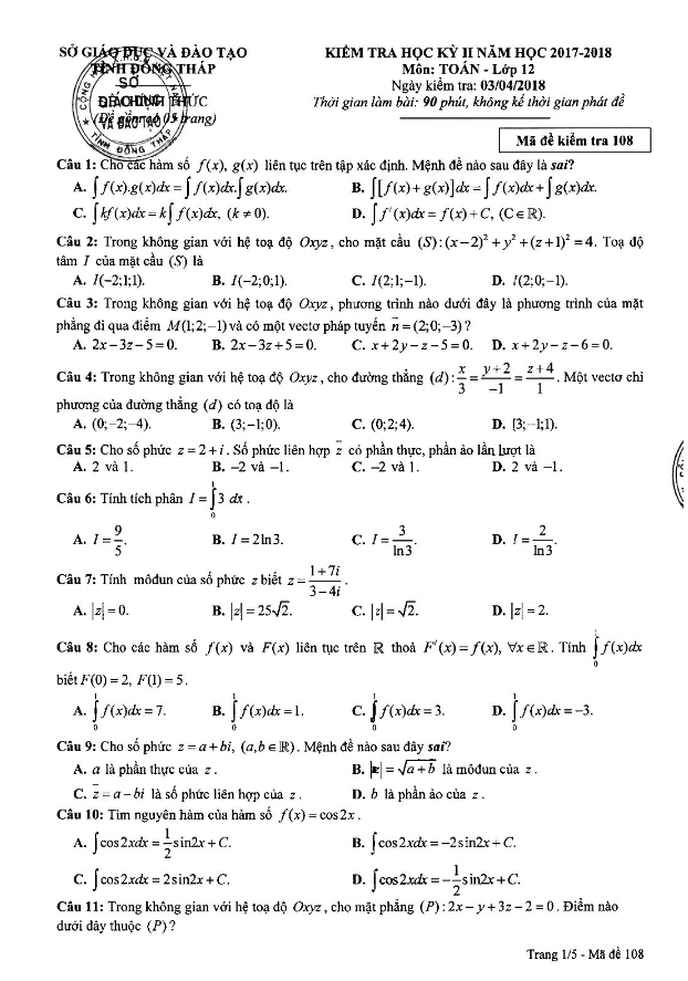Đề thi HK2 Toán 12 năm học 2017 – 2018 sở GD và ĐT Đồng Tháp