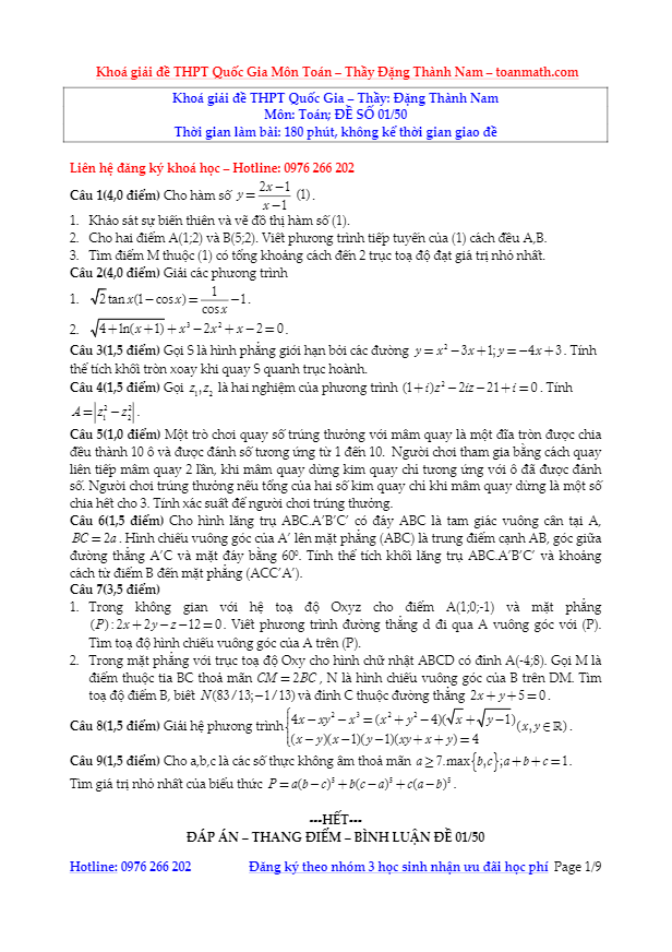 Đề thi thử Quốc gia 2016 môn Toán – Đặng Thành Nam – Đề số 1