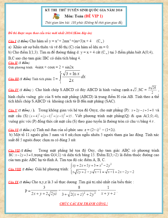 Đề thi thử THPT Quốc gia 2016 môn Toán – Đề VIP 1