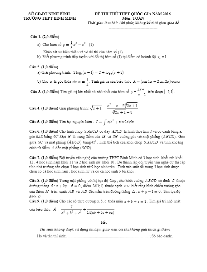 Đề thi thử THPT Quốc gia 2016 môn Toán trường Bình Minh – Ninh Bình