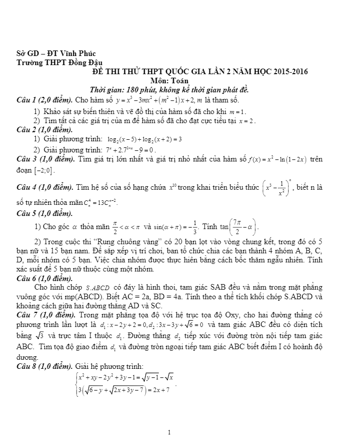 Đề thi thử THPT Quốc gia 2016 môn Toán trường Đồng Đậu – Vĩnh Phúc lần 2