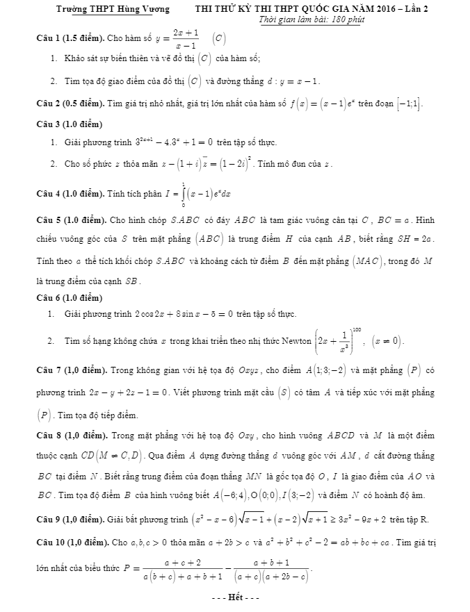 Đề thi thử THPT Quốc gia 2016 môn Toán trường Hùng Vương – Bình Phước lần 2