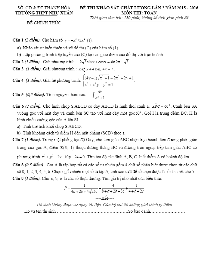 Đề thi thử THPT Quốc gia 2016 môn Toán trường Như Xuân – Thanh Hóa lần 2