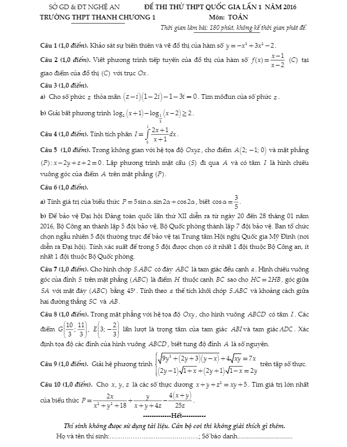 Đề thi thử THPT Quốc gia 2016 môn Toán trường Thanh Chương 1 – Nghệ An lần 1