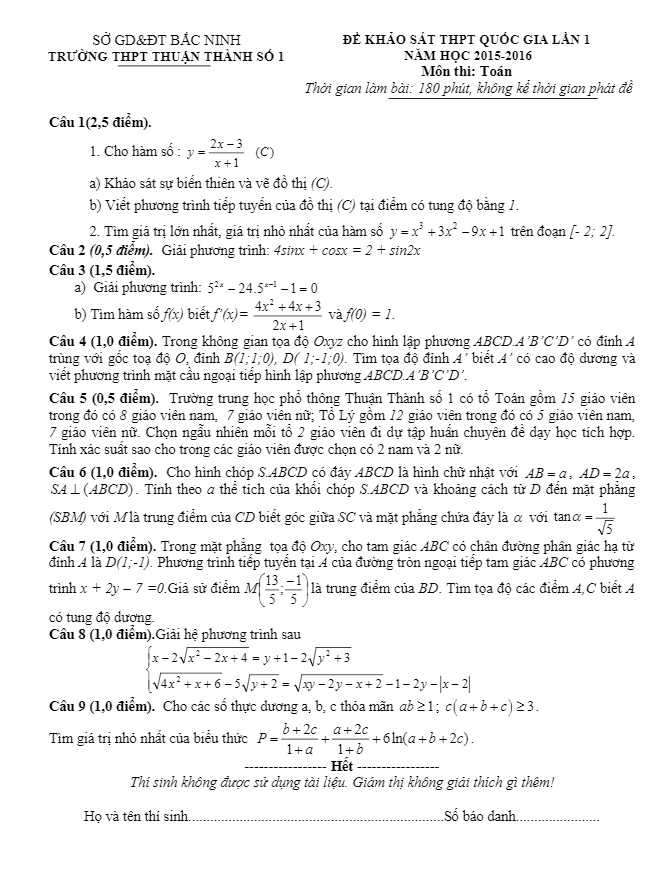 Đề thi thử THPT Quốc gia 2016 môn Toán trường Thuận Thành 1 – Bắc Ninh lần 1