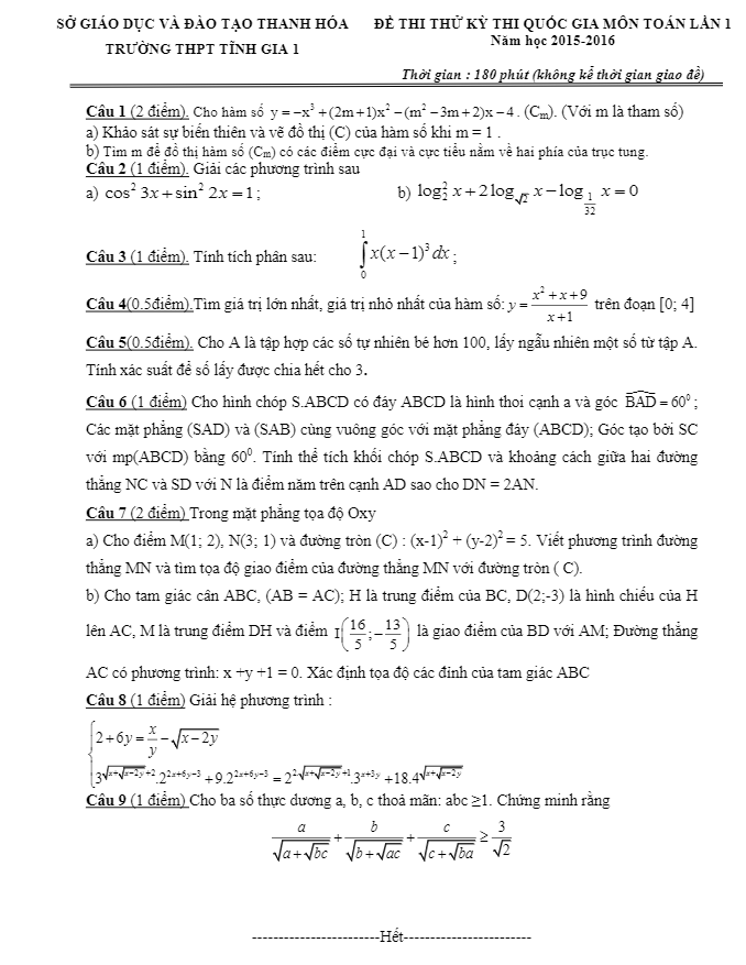 Đề thi thử THPT Quốc gia 2016 môn Toán trường Tĩnh Gia 1 – Thanh Hóa