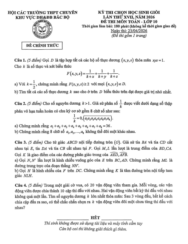 • Đề thi HSG Toán 10 lần 17 năm 2026 hội các trường THPT chuyên DH&ĐB Bắc Bộ
