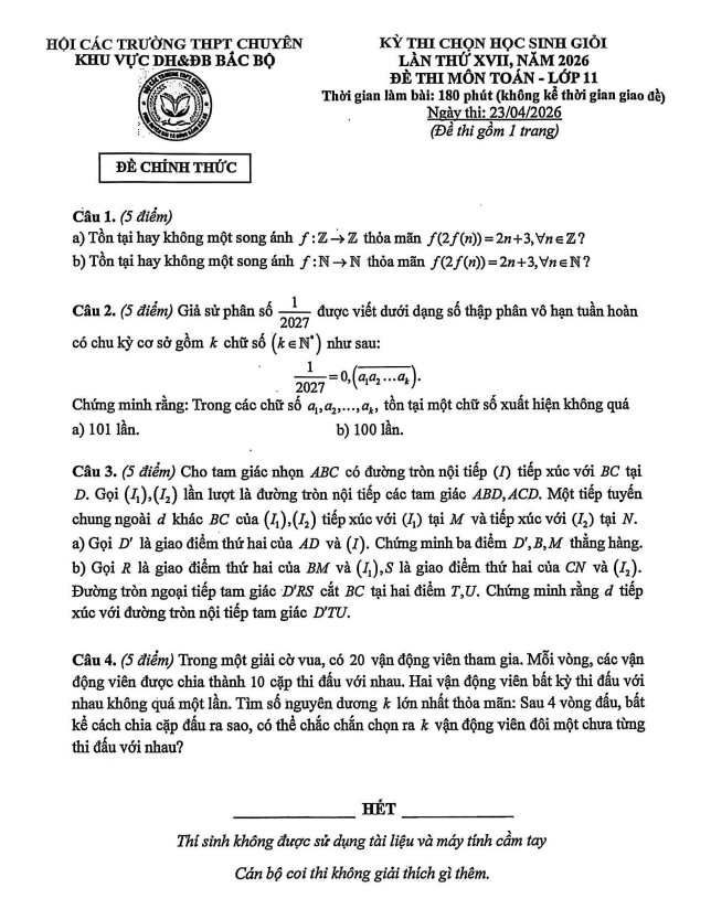 • Đề thi HSG Toán 11 lần 17 năm 2026 hội các trường THPT chuyên DH&ĐB Bắc Bộ