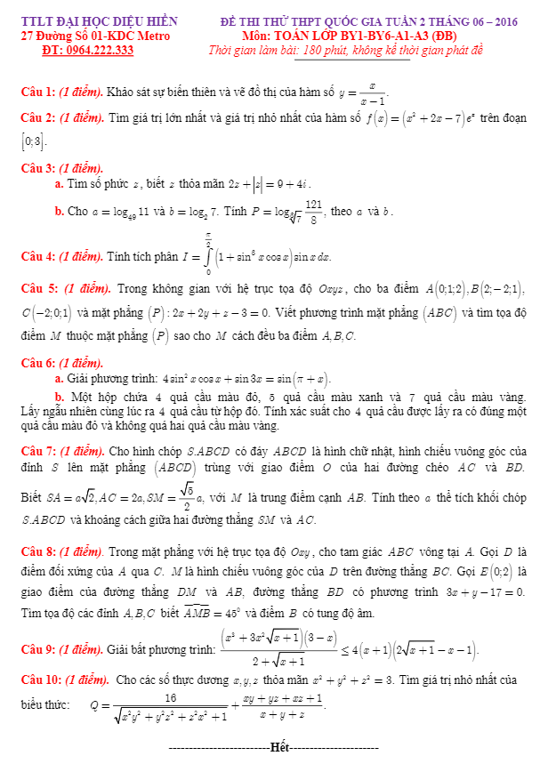 16 đề thi thử Quốc gia 2016 môn Toán trung tâm LTĐH Diệu Hiền – Cần Thơ