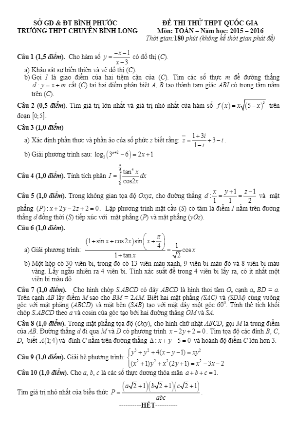 Đề thi thử Quốc gia 2016 môn Toán trường chuyên Bình Long – Bình Phước