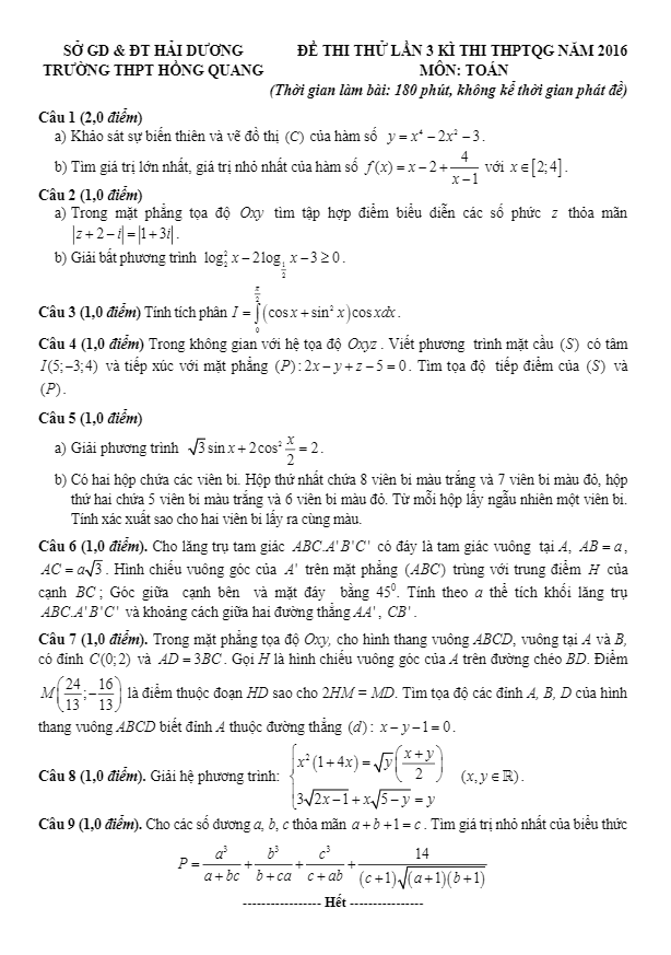 Đề thi thử Quốc gia 2016 môn Toán trường Hồng Quang – Hải Dương lần 3