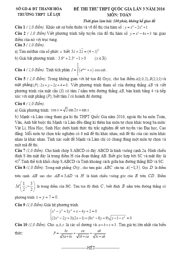Đề thi thử Quốc gia 2016 môn Toán trường Lê Lợi – Thanh Hóa lần 3