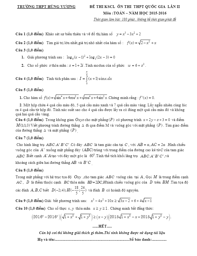 Đề thi thử Quốc gia 2016 môn Toán trường THPT Hùng Vương – Phú Thọ lần 2