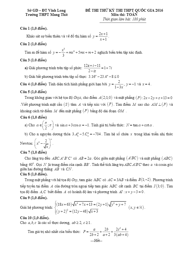 Đề thi thử Quốc gia 2016 môn Toán trường THPT Mang Thít – Vĩnh Long