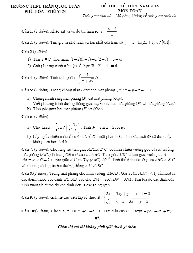 Đề thi thử Quốc gia 2016 môn Toán trường Trần Quốc Tuấn – Phú Yên